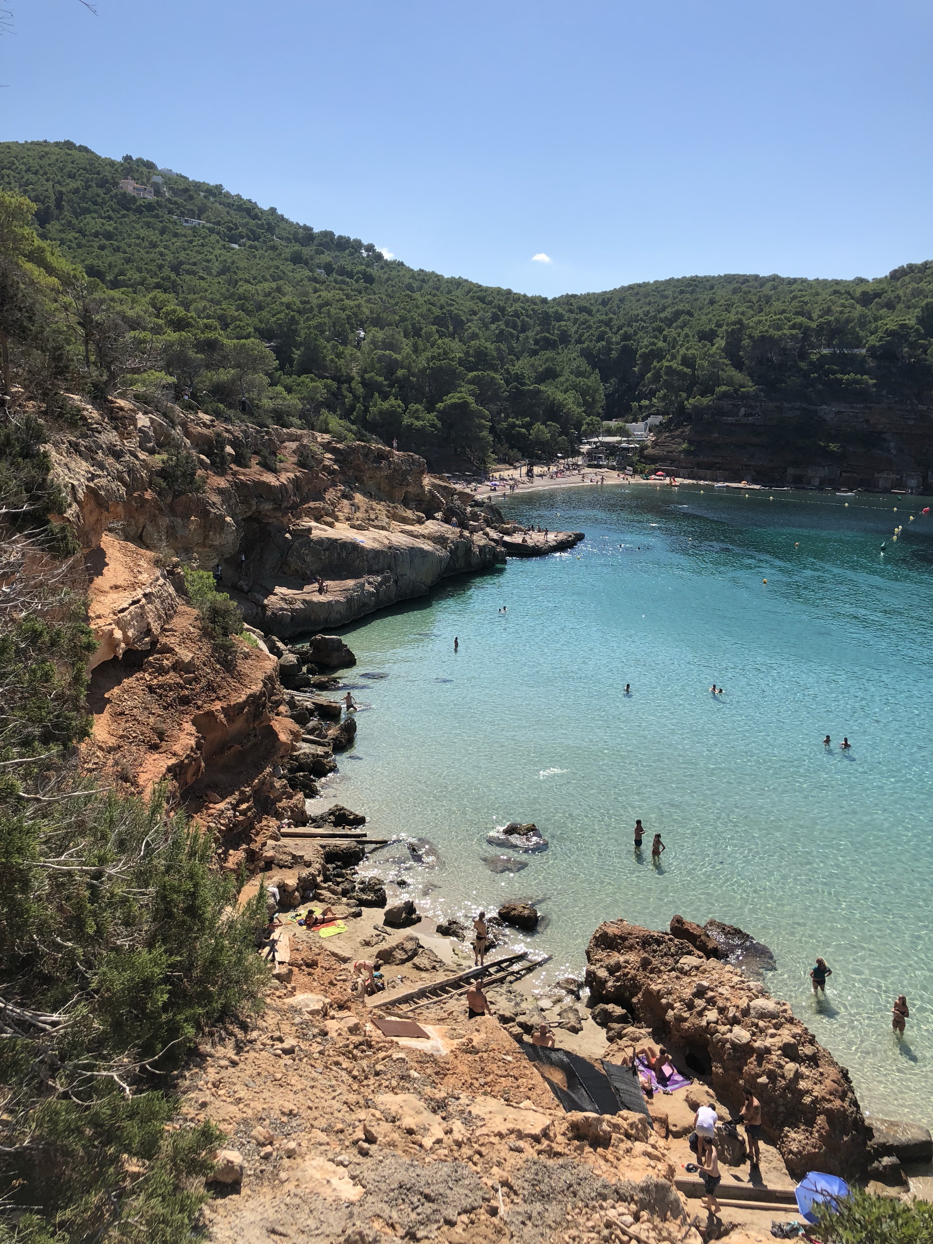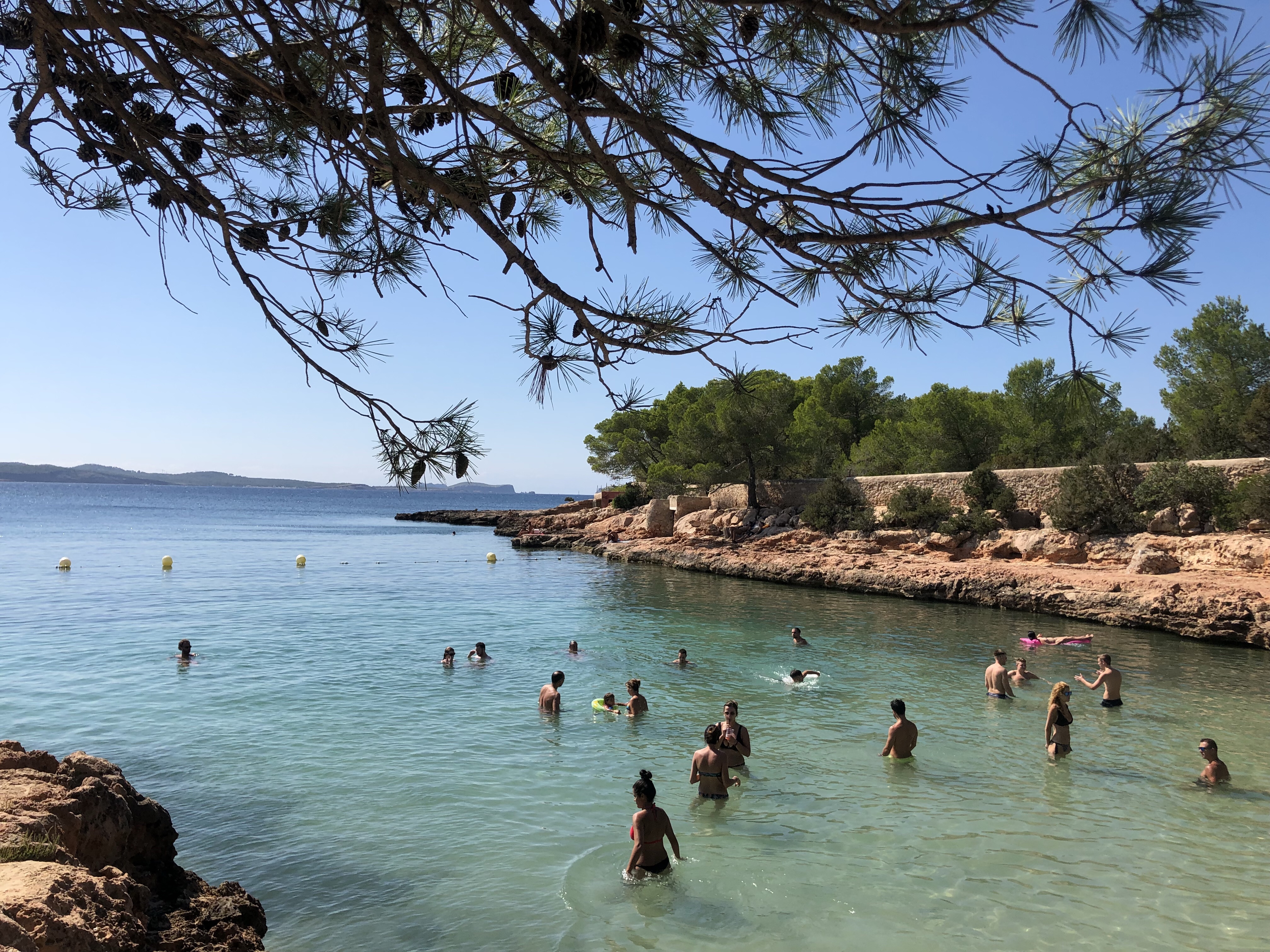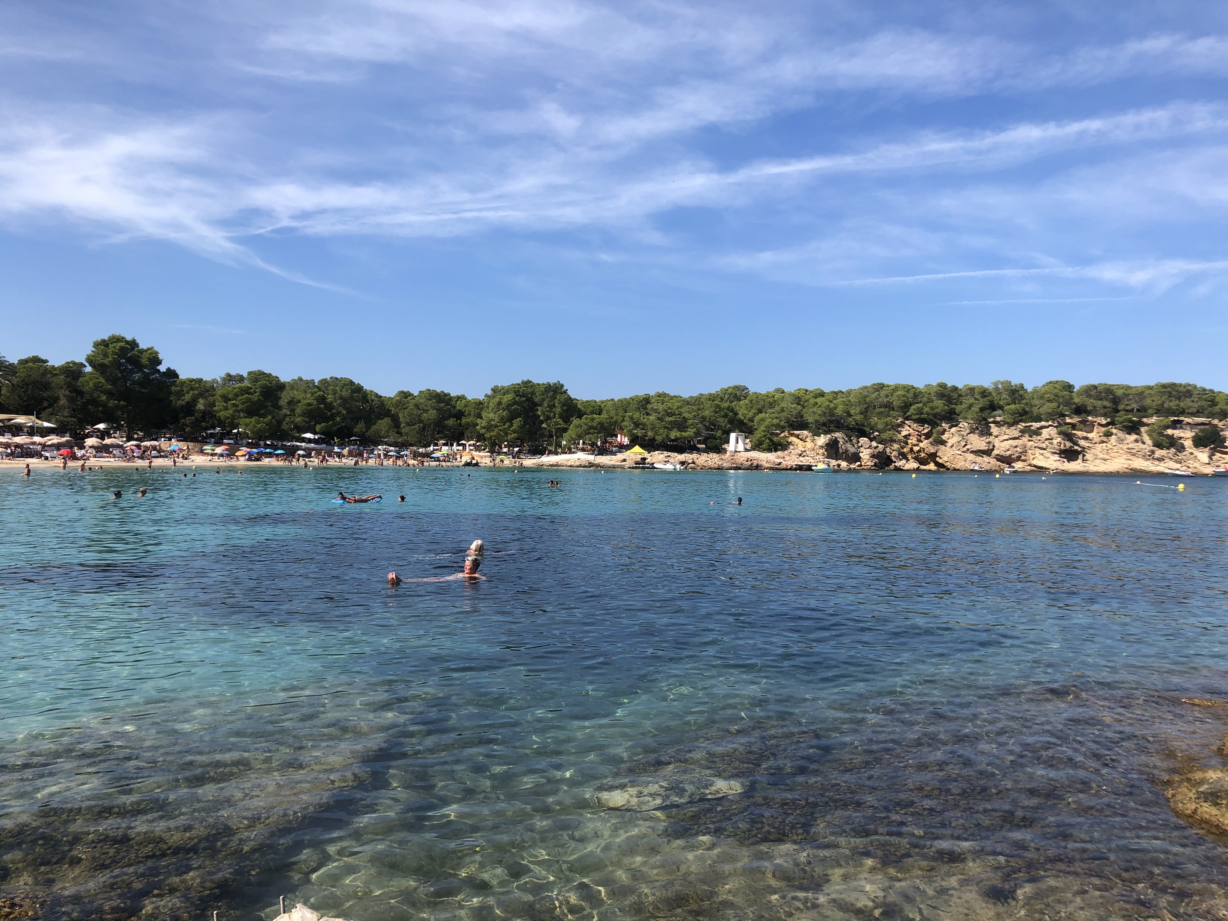 Accessible en 15 minutes en voiture depuis San Antonio, grande crique avec une grande plage de sable formant une petite baie. Plusieurs restaurants bordent la plage, possibilité de louer des transat ou alors vous pouvez poser votre serviette sur la plage, elle est grande. Parking payant 5€ offrant une bière ou de l’eau. Crique plutôt familiale, très jolie, entourée de rochers.