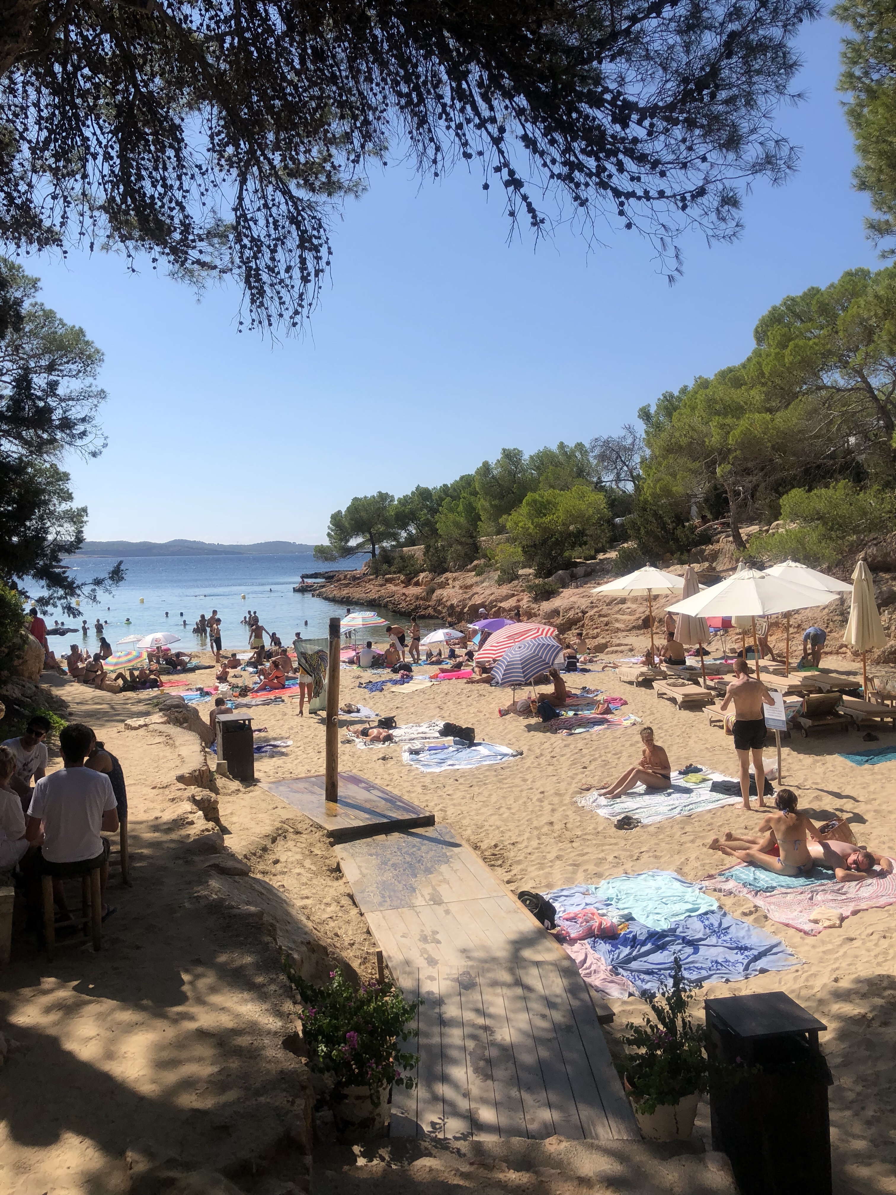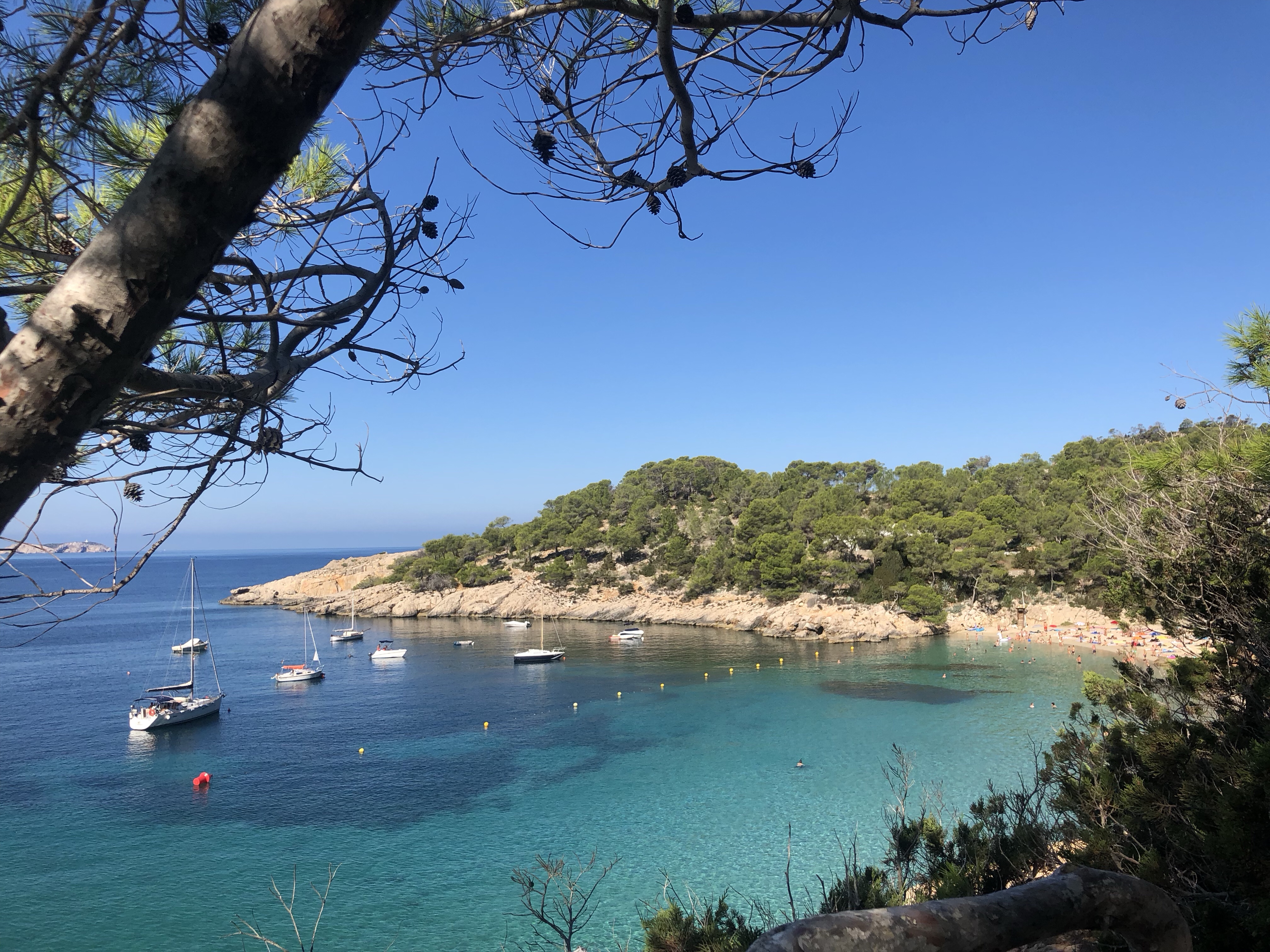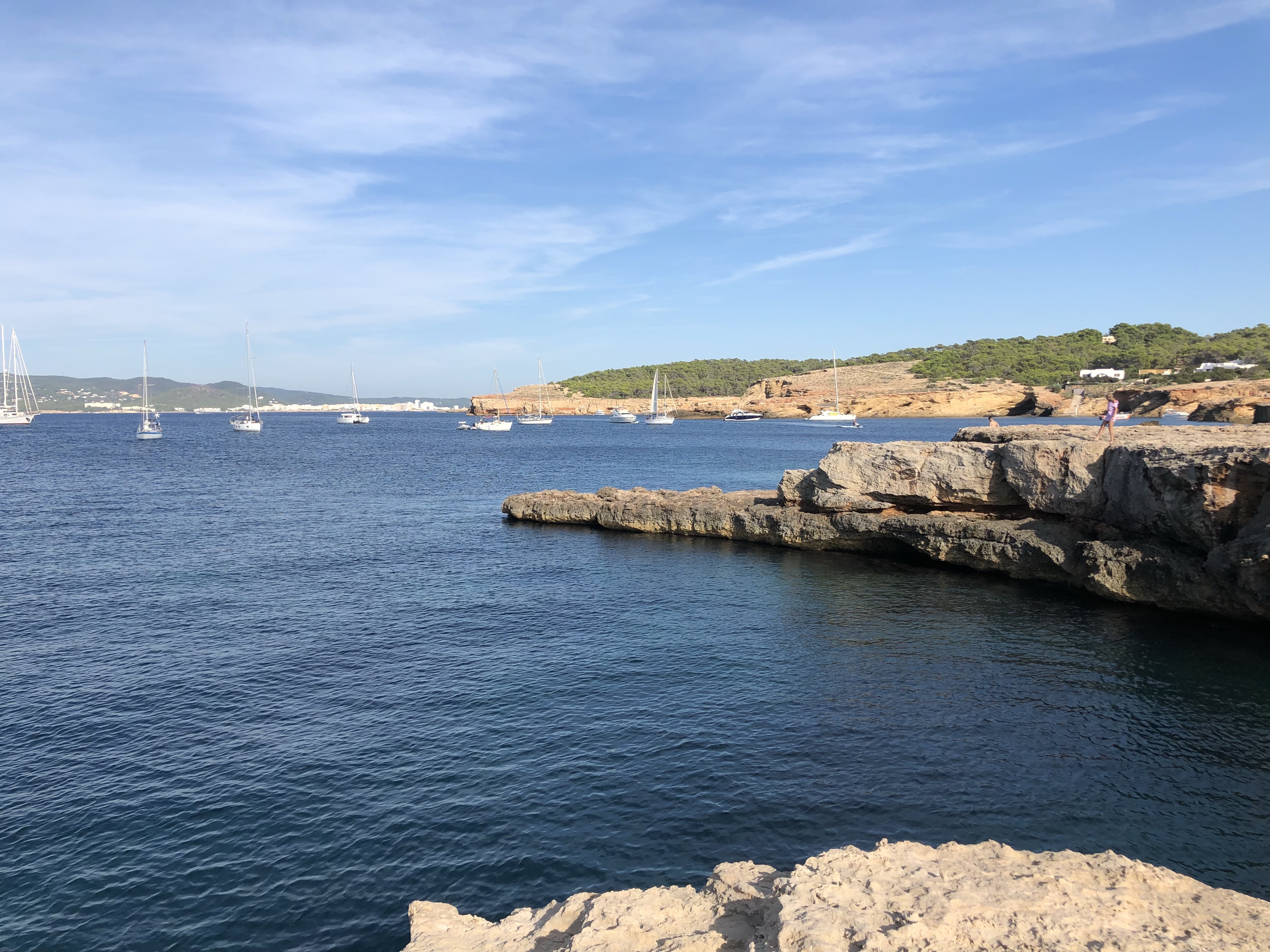 Accessible en 15 minutes en voiture depuis San Antonio, grande crique avec une grande plage de sable formant une petite baie. Plusieurs restaurants bordent la plage, possibilité de louer des transat ou alors vous pouvez poser votre serviette sur la plage, elle est grande. Parking payant 5€ offrant une bière ou de l’eau. Crique plutôt familiale, très jolie, entourée de rochers.