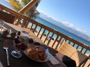 Au rez de chaussé se situe le bar/restaurant de l’hôtel où sont servis les petis déjeuners. L’hôtel a plusieurs étages et au roof top se trouve la piscine avec plusieurs transats autour. Depuis la piscine, superbe vue sur tout Seminiak et la piscine s’avère très utile car il y a beaucoup de vagues à la plage donc pas forcément évident de s’y baigner. Nous sommes bons nageurs et on a pas pu s’y baigner.