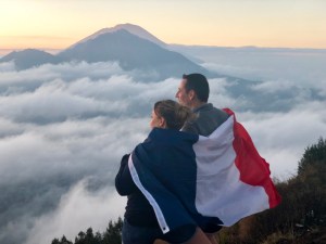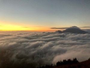 Au départ, cela démarre par une route goudronnée, mais rapidement on arrive sur un chemin de terre. Et là les choses se gâtent, on s’aide d’une lampe torche pour savoir où marcher. C’est super beau, on voit pleins d’étoiles alors qu’à Ubud c’était de la grosse pluie quand on est parti. Et aussi, on voit de loin de nombreuses loupiotes qui tracent le chemin et là je commence à me rendre compte que c’est super haut. On marche 30 minutes, je commence déjà à avoir bien chaud et à être essoufflée. Et là notre guide nous informe que la partie difficile commence et là en effet il ne s’est pas trompé. Malgré quelques pauses, c’est vraiment dur !