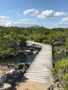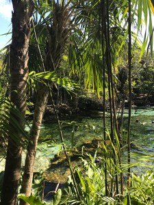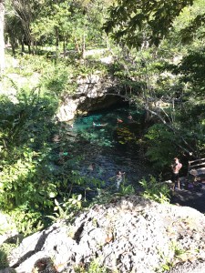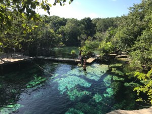 Direction El Cénoté Azul sur la route direction Playa del Carmen. Super beau, eau à hauteur du sol, on peut faire le tour par des petits sentiers, plusieurs pontons pour le traverser, eau transparente, peu de poissons par contre. Un peu de snorkelling et de lecture sur le ponton les pieds dans l’eau, il fait super beau et chaud.