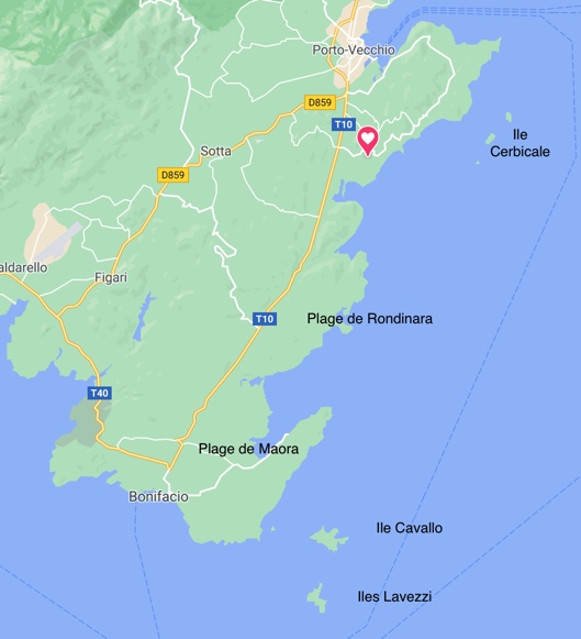 Départ du Port de Porto-Vecchio à 9h, on commence par longer la côte en descendant vers le sud direction les îles Lavezzi, avec une halte snorkelling dans une petite crique où il n’y a personne : Plage de Carataggio