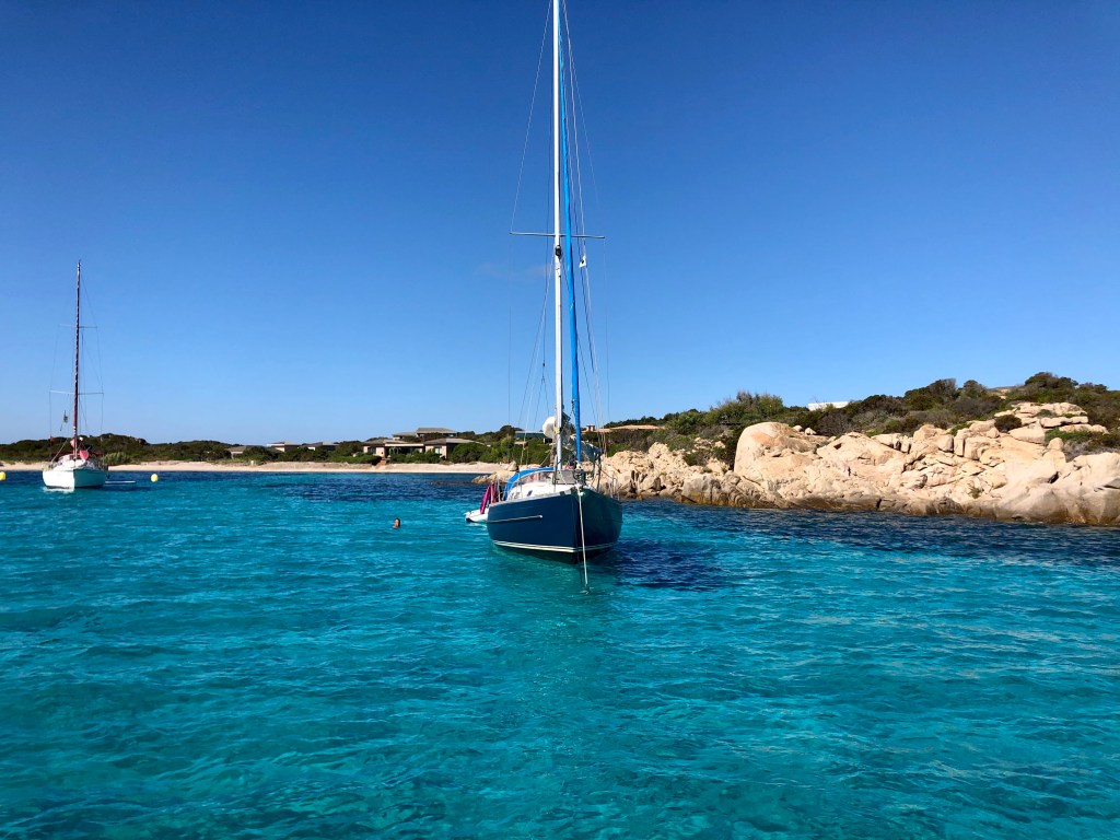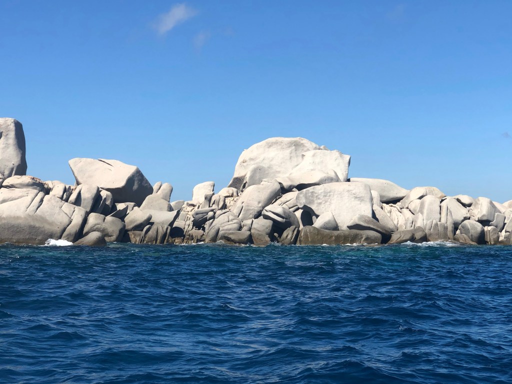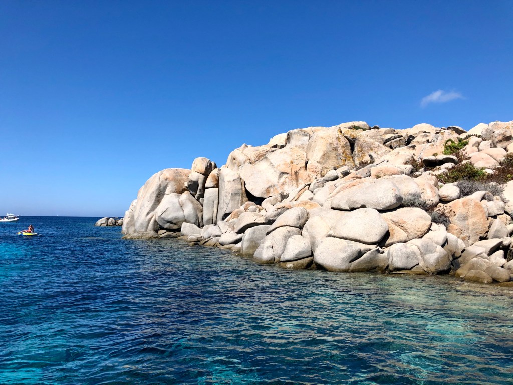 Ensuite, en continuant encore 5 minutes, on rejoint les îles Lavezzi, et là des dizaines et des dizaines de bateaux aux abords des îles, vraiment magnifique ! Une eau cristalline, qui permet de faire du snorkelling, des cailloux tellement beaux et lisses (cela ressemble un peu aux paysages des Seychelles !). Alors oui beaucoup de monde, il est difficile de se sentir seuls, c’est la compétition aux plus bateaux mais le paysage en vaut la peine. On y fait une halte pour un apéritif et snorkelling.