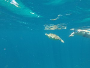 Pour cette après-midi là, on décide de se reposer sur les transats d’un petit resto au nord Ouest de l’île. On part à la recherche de tortues en snorkelling et là pour la première fois on en trouve une qui est en train de nager à côté de nous et pas de dormir au sol comme d’habitude.
