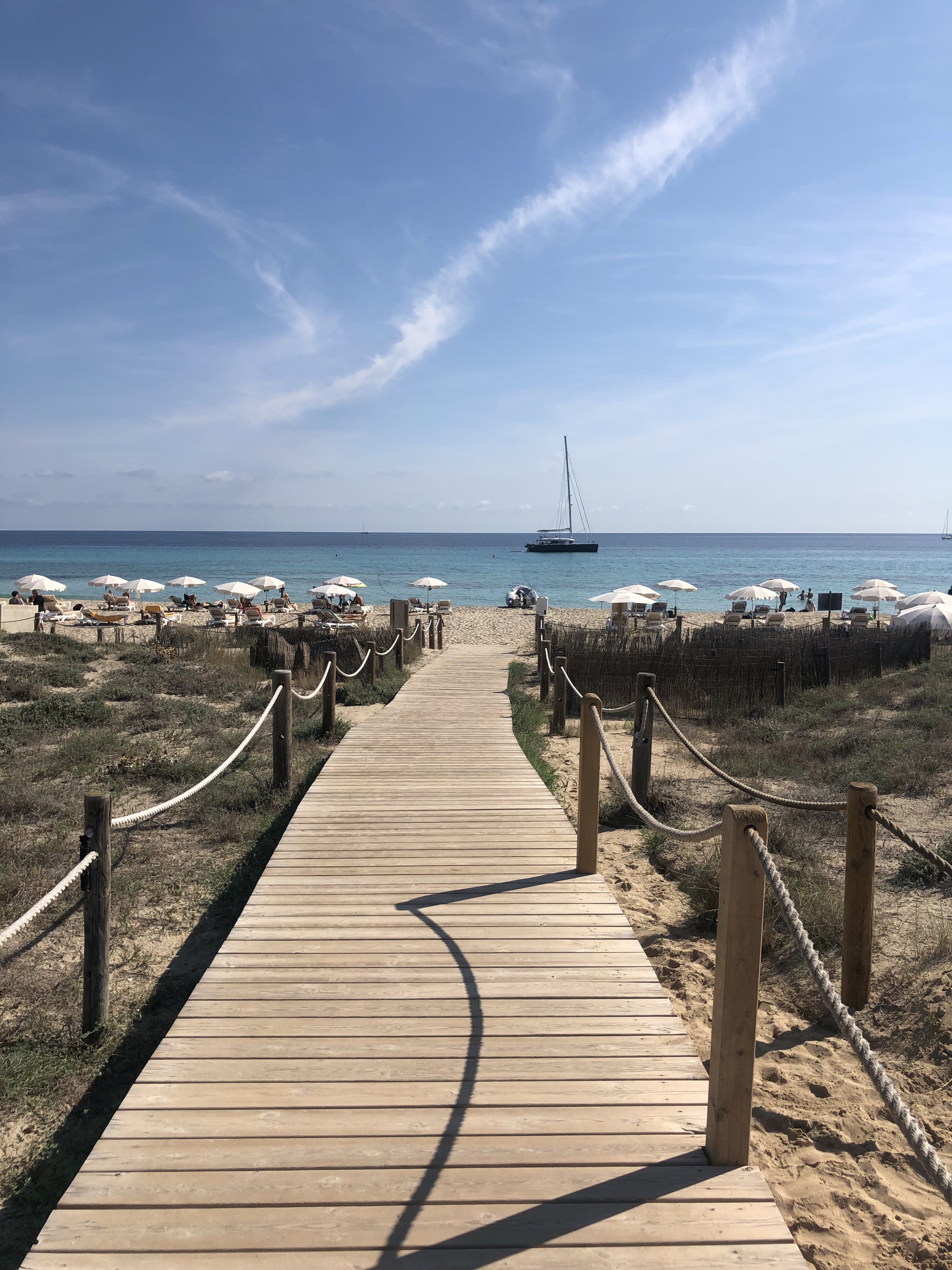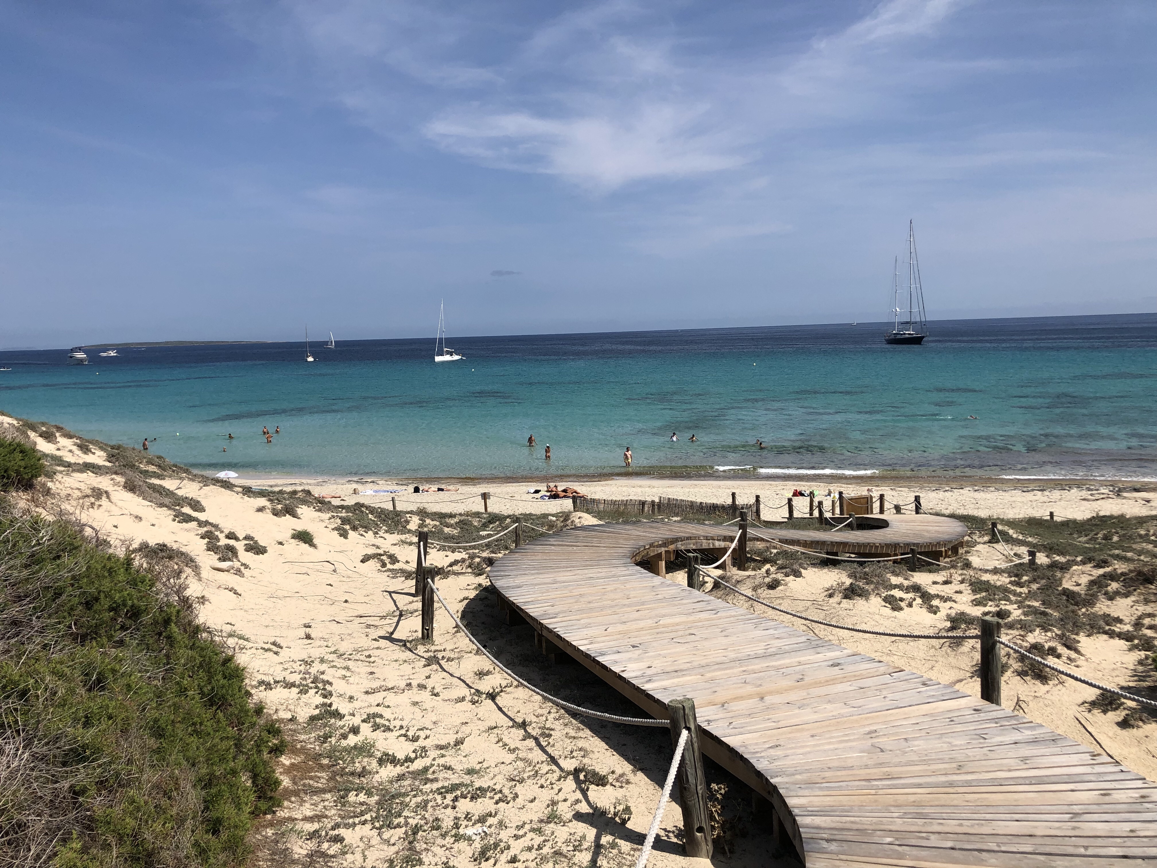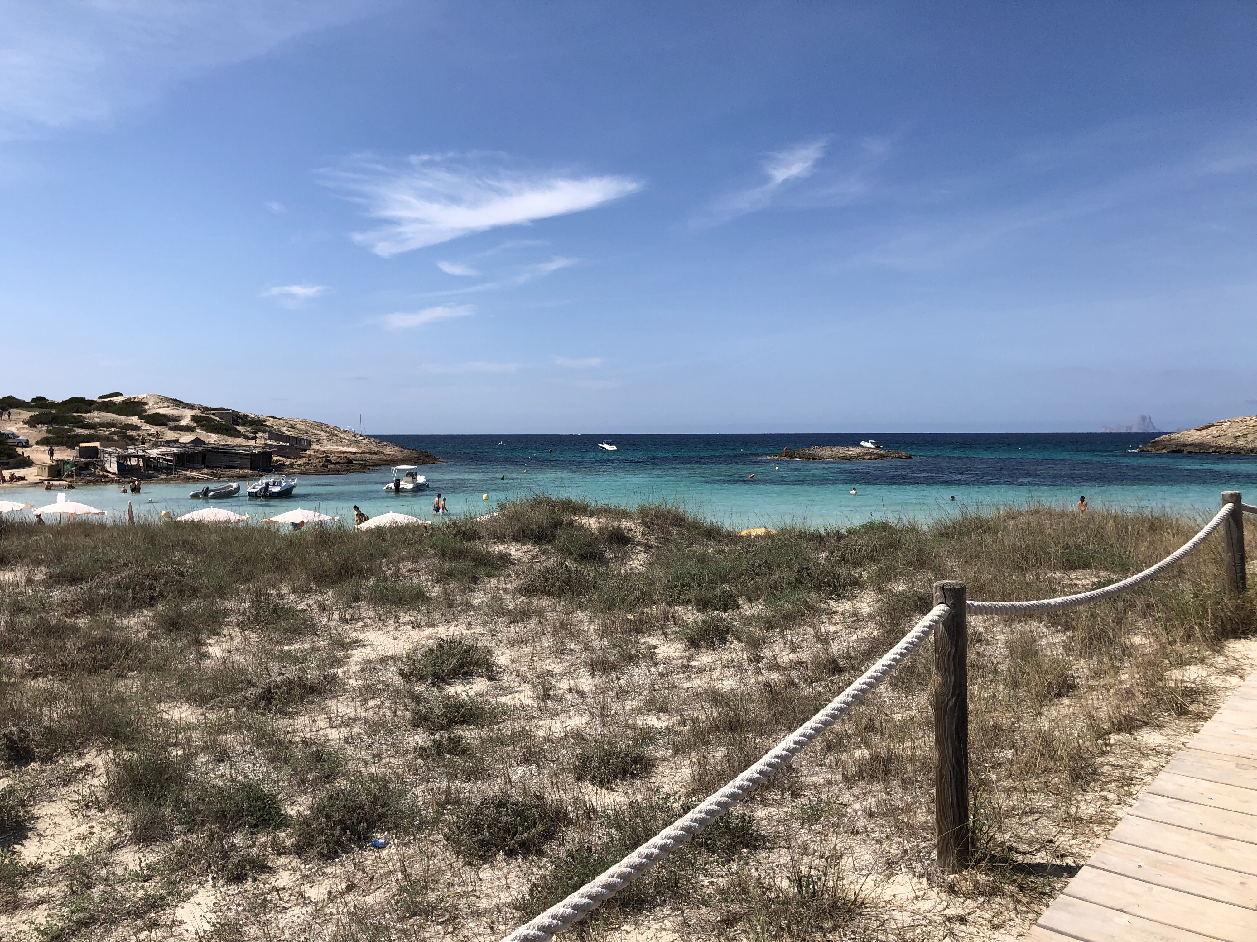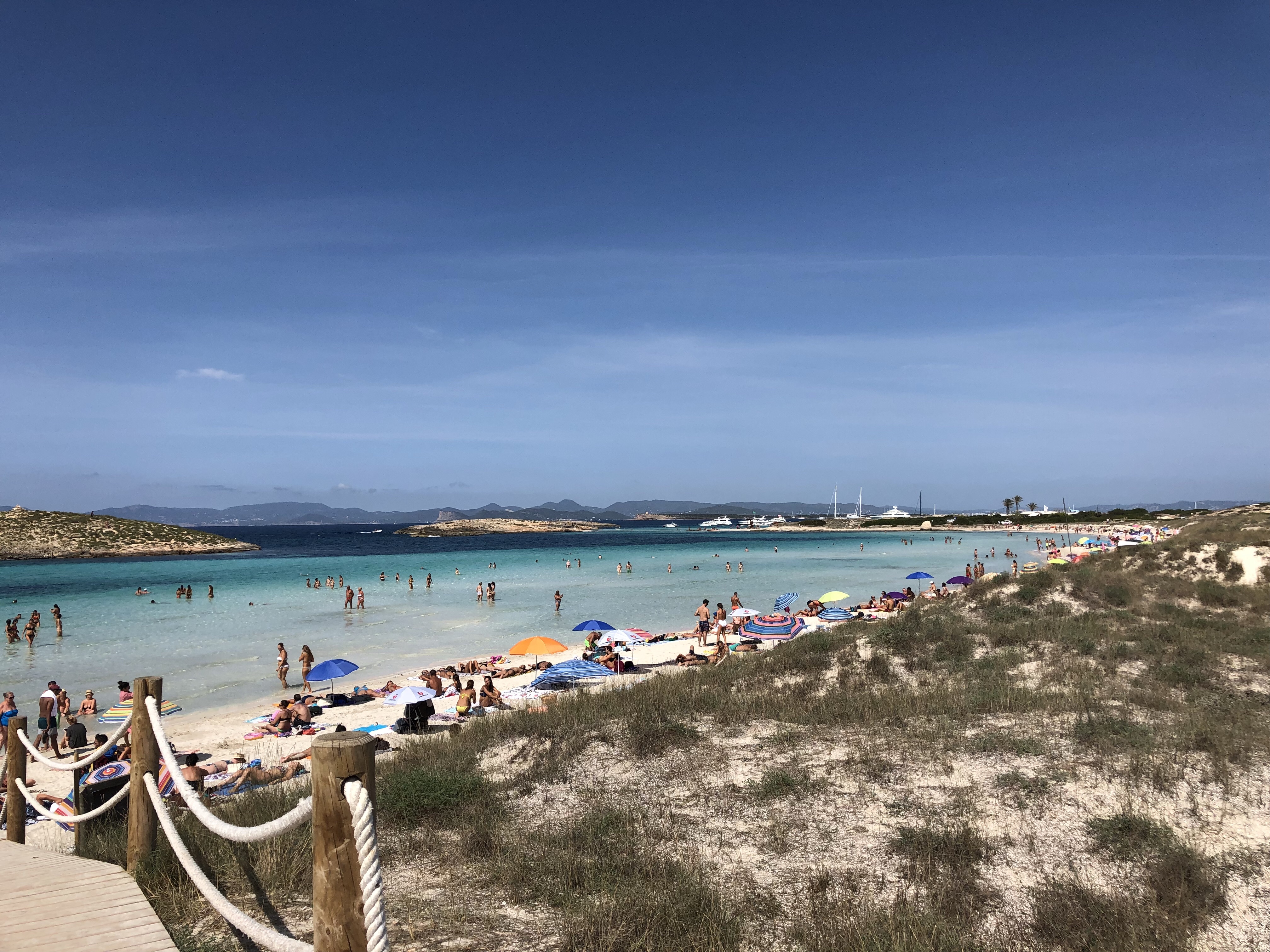Accessible en 15 minutes en voiture depuis San Antonio, grande crique avec une grande plage de sable formant une petite baie. Plusieurs restaurants bordent la plage, possibilité de louer des transat ou alors vous pouvez poser votre serviette sur la plage, elle est grande. Parking payant 5€ offrant une bière ou de l’eau. Crique plutôt familiale, très jolie, entourée de rochers.
